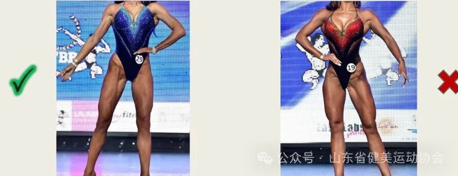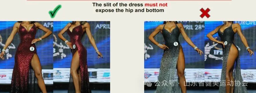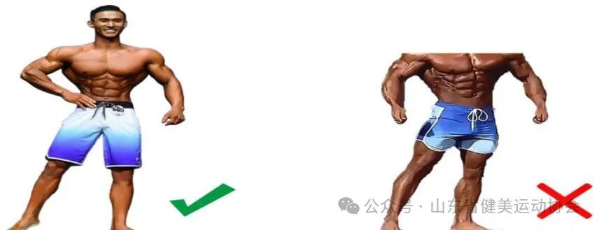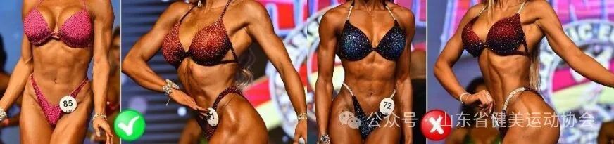 8、健身比基尼比赛按以下方式进行:预赛穿自选比基尼展示形体;半决赛进行形体展示与比较评分;决赛运动员逐一入场进行“I”字路线行走及定位造型展示。自选比基尼只允许在比基尼上片有拼接,下片不可以有拼接,并至少覆盖 1/3 臀部。