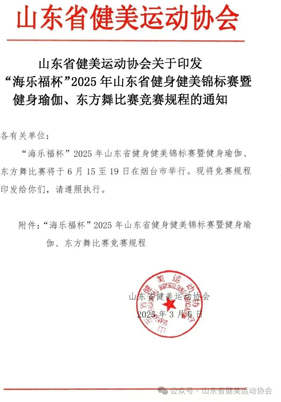“海乐福杯”2025 年山东省健身健美锦标赛暨健身瑜伽、东方舞比赛竞赛规程“海乐福”杯 2025 年山东省健身健美锦标赛暨健身瑜伽、东方舞比赛。时间:2025 年 6 月 15 日至 19 日。地点:烟台市福山区湘潭路中日韩体育文化(烟台)产业园。山东省各市健美健身协会、健身俱乐部,省内各大专院校、体育院系及个人。1. 男子古典健美:按身高(cm)、体重(kg)划分为 5 个组别:身高 168.01~171(含), 体重≤身高-100+2身高 171.01~175(含),体重≤身高-100+4身高 175.01~180(含),体重≤身高-100+72. 男子传统健美成年组:按体重划分为 6 个级别A 组:50~55 岁,1975 年 6 月 15 日以前至 1970 年 6 月 15日(含)以后出生B 组:55 岁以上,1970 年 6 月 15 日以前出生4. 男子传统健美青年组(18~23 岁) :按体重分为 2 个级别5. 男子传统健美院校组:按体重划分为 4 个级别9. 院校组男子健身、男子健体、男子健身模特、女子形体、健身比基尼、女子健身模特比赛,原则上每个项目设 A、B 两个组,组委会根据实际报到情况最终确定分组。10. 健身健美集体造型比赛 设公开组(院校组可参加)11. 健身健美全场冠军比赛 设男子古典健美、男子传统健美、院校组男子传统健美、男子健体、院校组男子健体、健身比基尼、男子健身模特、女子健身模特比赛,各级(组)别前 2名参加比赛。健身瑜伽比赛社会组、院校组分别设四个组别 1.男子单人组1. 比赛执行中国健美协会 2024 版《健身健美竞赛规则》。2. 健美比赛根据报名人数进行预赛、半决赛和决赛。预赛前 10 名进入半决赛;半决赛前 6 名进入决赛。各级(组)别参赛人数少于 3 人的,运动员合并级(组)别比赛。男子健美比赛服装要求:传统健美比赛运动员需身着单色、不透明短裤,赛裤须至少盖住 3/4 的臀部,侧边不少于 5cm,不允许使用填充物。古典健美运动员需身着任意单色、不透明短裤,侧边至少为 15cm,盖住全部臀部及前侧部位,不允许使用填充物。